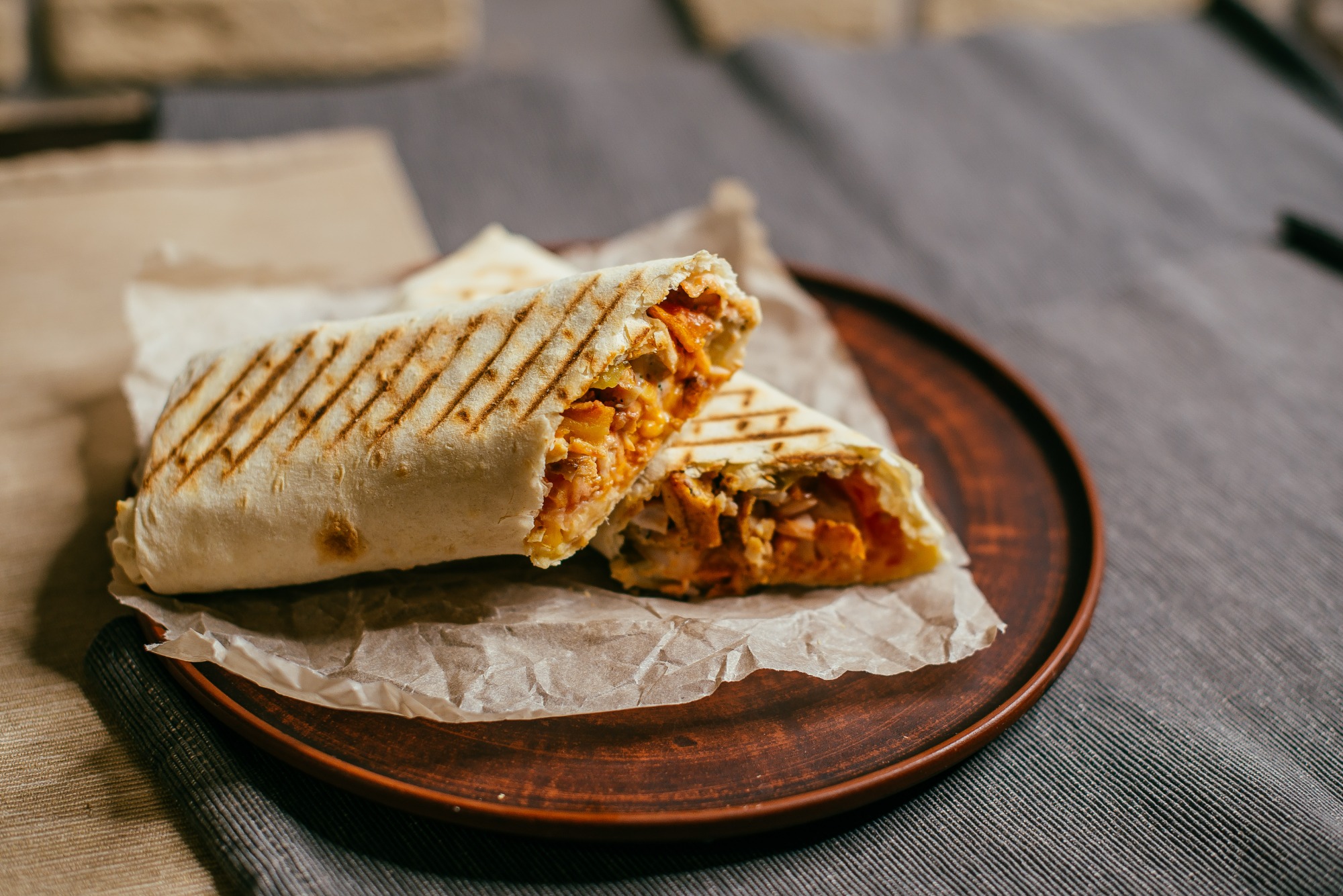 mięso z kurczaka, wołowiny lub mix mięs 160g, surówka z czerwonej kapusty, kapusta pekińska, sałata lodowa, pomidor ogórek, cebula i sos